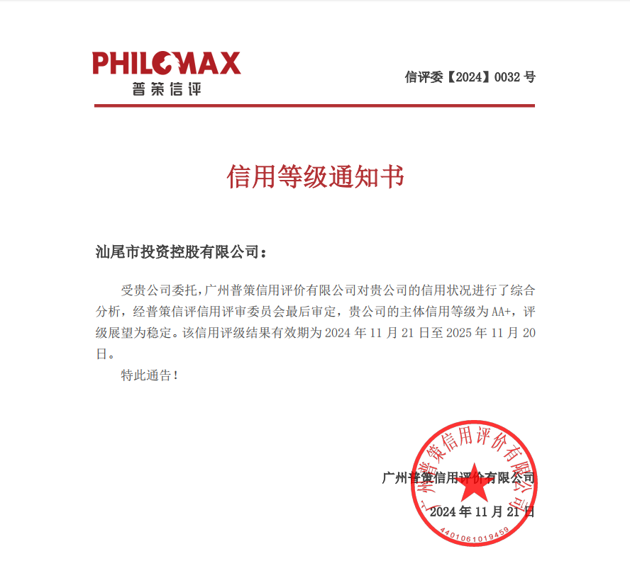 近日,經(jīng)廣州普策信用評(píng)價(jià)有限公司采用城市產(chǎn)業(yè)開發(fā)運(yùn)營(yíng)企業(yè)評(píng)級(jí)模型綜合評(píng)定,汕尾市投資控股有限公司獲得主體信用AA+評(píng)級(jí),評(píng)級(jí)展望為穩(wěn)定,成為汕尾市首家獲得AA+信用評(píng)級(jí)的國(guó)有企業(yè)。 AA+主體信用評(píng)級(jí)是資本市場(chǎng)信用評(píng)級(jí)的重要分水嶺,也是國(guó)內(nèi)投資級(jí)和投機(jī)級(jí)的重要?jiǎng)澐謽?biāo)準(zhǔn)。此次獲得AA+主體信用評(píng)級(jí),既是資本市場(chǎng)對(duì)汕尾投控在市場(chǎng)競(jìng)爭(zhēng)力、運(yùn)營(yíng)能力和可持續(xù)發(fā)展能力等方面的認(rèn)可和肯定,也有利于提振汕尾資本市場(chǎng)形象,提升公司市場(chǎng)競(jìng)爭(zhēng)力和影響力,為加快實(shí)現(xiàn)公司高質(zhì)量發(fā)展提供更大規(guī)模、更多渠道、更低成本的資金支持。 展望未來,公司將進(jìn)一步聚焦市委市政府重點(diǎn)工作部署和“4+X”主業(yè)主責(zé)、“5+1+N”業(yè)務(wù)板塊,充分發(fā)揮AA+主體信用評(píng)級(jí)優(yōu)勢(shì),牢牢把握市場(chǎng)機(jī)遇,不斷拓展融資渠道、降低融資成本、壯大資產(chǎn)規(guī)模,持續(xù)增強(qiáng)核心功能、提升核心競(jìng)爭(zhēng)力,全力打造“值得信賴的現(xiàn)代國(guó)企集團(tuán)”,為推動(dòng)汕尾經(jīng)濟(jì)社會(huì)高質(zhì)量發(fā)展貢獻(xiàn)更大力量。