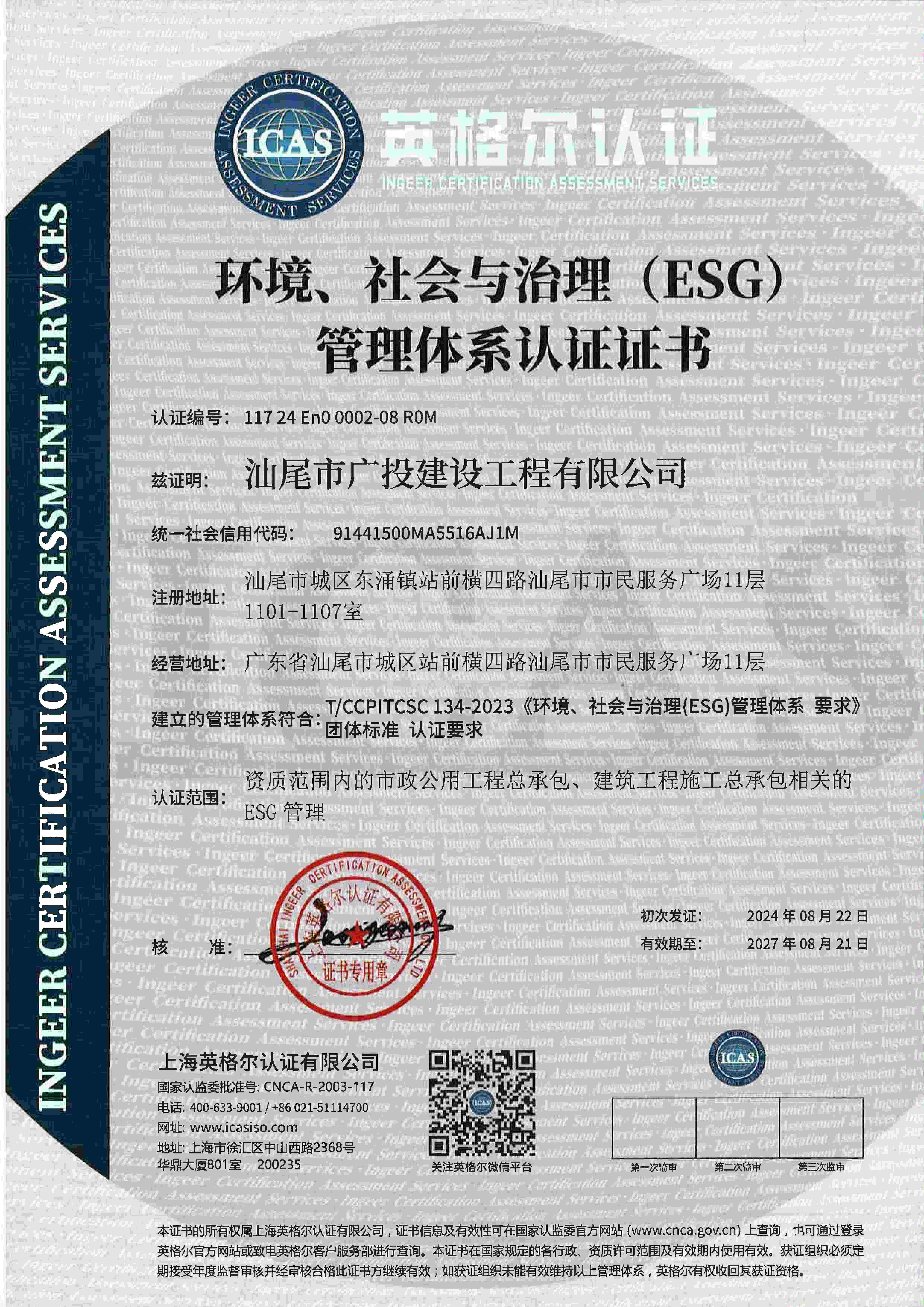為推進(jìn)企業(yè)綠色發(fā)展,實(shí)現(xiàn)“雙碳”目標(biāo),汕尾市廣投建設(shè)工程有限公司(以下簡(jiǎn)稱“汕尾廣投公司”)率先引入ESG管理體系,于近日榮獲中國(guó)基建行業(yè)首個(gè)ESG管理體系認(rèn)證。 ESG體系強(qiáng)調(diào)綠色低碳發(fā)展、社會(huì)責(zé)任、員工權(quán)益和公司治理等方面,引入該體系建設(shè)可從整體上持續(xù)優(yōu)化管理模式。通過(guò)全要素成體系推進(jìn),8月22日汕尾廣投公司榮獲由ICAS英格爾認(rèn)證頒發(fā)的中國(guó)基建行業(yè)首張ESG管理體系認(rèn)證證書(shū),成為國(guó)內(nèi)基建領(lǐng)域推行ESG管理的先行者。同時(shí),汕尾廣投公司榮獲ESG管理體系認(rèn)證是整個(gè)基建行業(yè)綠色轉(zhuǎn)型的一個(gè)重要里程碑,為推動(dòng)行業(yè)向綠色低碳轉(zhuǎn)型提供了新樣本。 汕尾廣投公司成立以來(lái),堅(jiān)持“創(chuàng)新、協(xié)調(diào)、綠色、開(kāi)放、共享”的發(fā)展理念,承接了多個(gè)重點(diǎn)民生項(xiàng)目和應(yīng)急工程,已成長(zhǎng)為區(qū)域基建領(lǐng)域的骨干力量。接下來(lái),汕尾廣投公司將繼續(xù)發(fā)揮國(guó)企優(yōu)勢(shì)和擔(dān)當(dāng),利用高新技術(shù)企業(yè)成功創(chuàng)建優(yōu)勢(shì),進(jìn)一步推進(jìn)綠色建筑和低碳技術(shù)的研發(fā)應(yīng)用,充分釋放ESG體系治理效能,為實(shí)現(xiàn)公司高質(zhì)量發(fā)展,落實(shí)省市《碳達(dá)峰實(shí)施方案》,助力區(qū)域基建行業(yè)綠色低碳轉(zhuǎn)型貢獻(xiàn)力量。